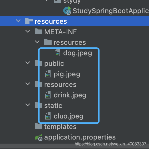 新建 Spingboot web项目试下,新项目只有 /static 目录 ,手动创建其他几个静态资源文件夹,每个目录添加1张图片