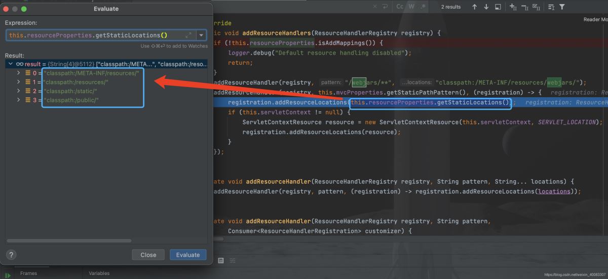 不要停留,继续看第二个addResourceHandler 方法,打断点看看这个方法添加了什么规则