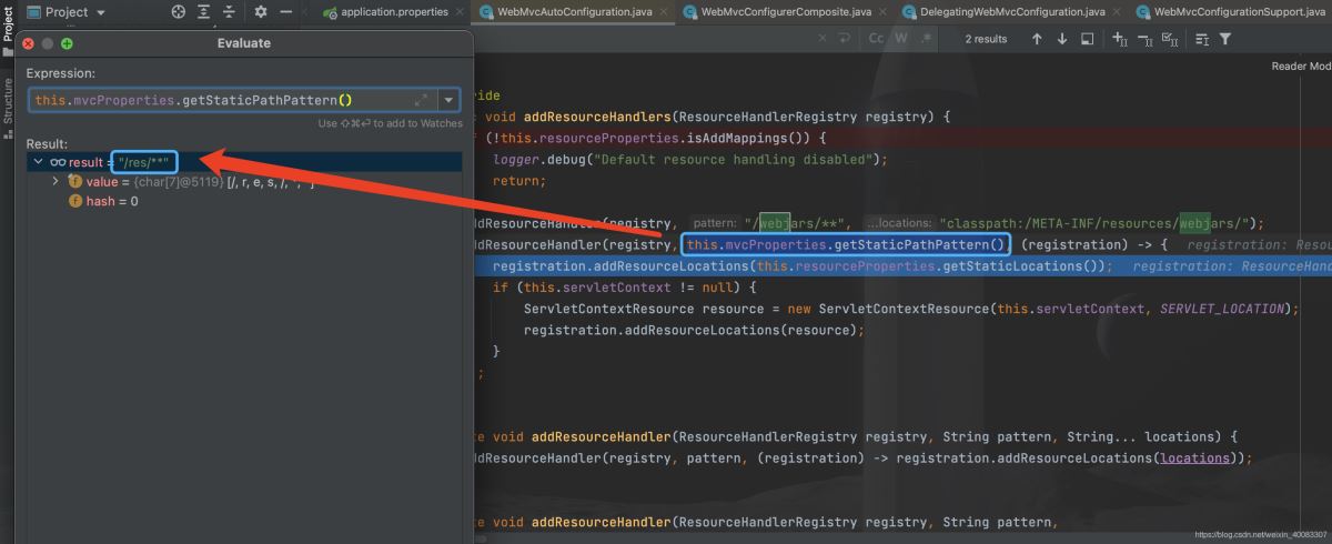 另外,访问路径前缀是在 this.mvcProperties.getStaticPathPattern() 获取的,配置上: