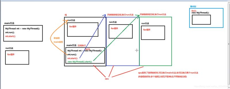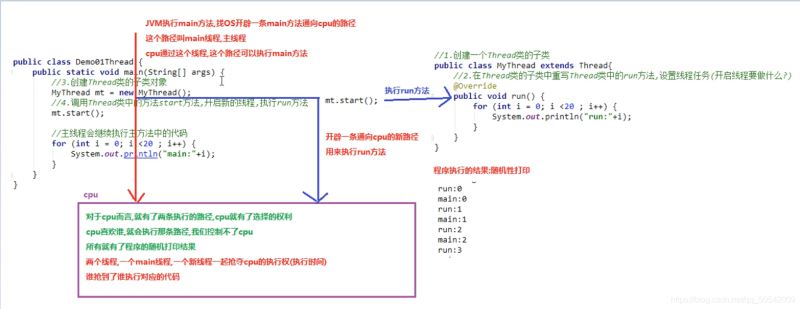 - 调用Thread类中的start方法,开启新的线程执行run方法