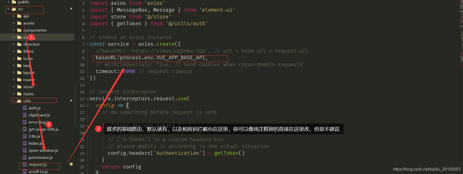 1、先看一下请求配置文件,看axios.create这个方法,baseURL是基础路由