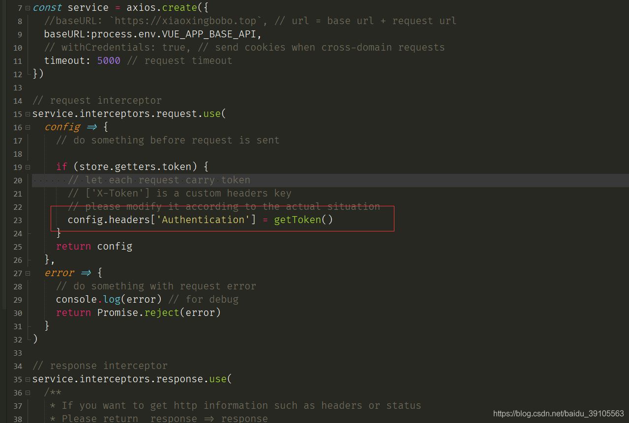 2、然后再看service.interceptors.request.use,设置token请求头,我后端集成的是jwt,所以请求头是Authentication,如图