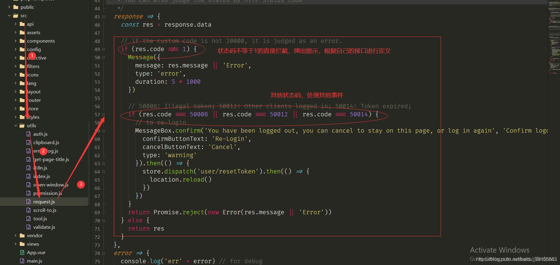 3.设置自己的状态码,看service.interceptors.response.use,如图,设置为自己的状态码
