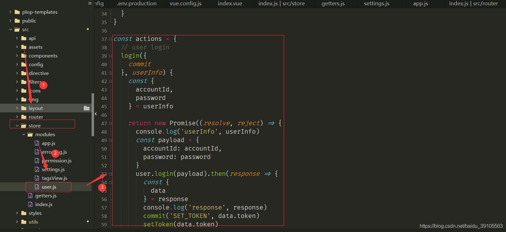 6、在src-view-login-index.html文件中,找到Vue-Element-Admin的登录接口,添加如下代码,如图,把官方的请求方式注释掉,this.loginForm是请求参数