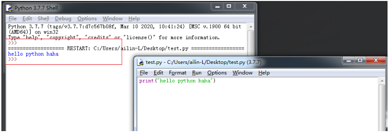 3)在新创建的文件(test.py)中写Python代码,按F5执行,在IDLE初始窗口中查看结果。