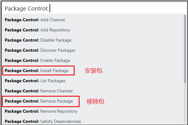 对于我们来说,Package Control插件常用的两个功能就是安装包和移除包。用的时候点击Package Control:Install Package选项,搜索你需要安装的包。或者点击Package Control:Remove Package选项,选择你要删除的包进行卸载。
