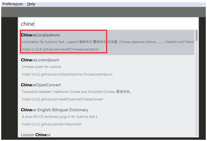 点击Preferences —> 选择Package Control:Install Package —> 输入ChineseLocalizations