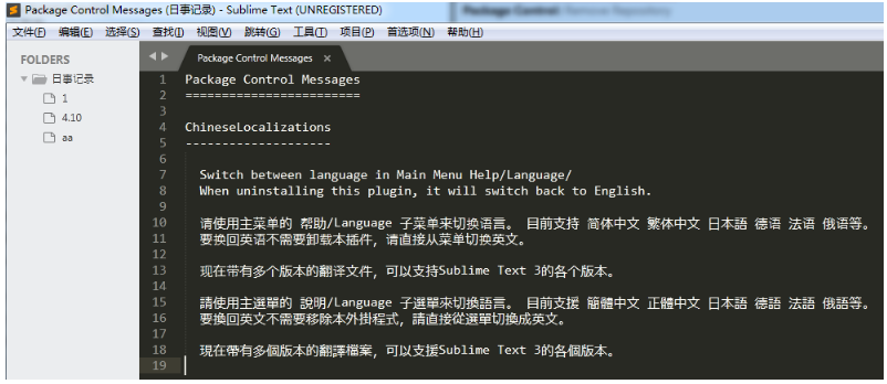 选中之后会自动的安装,一会你的Sublime3就会变成中文显示了(会有点慢)。