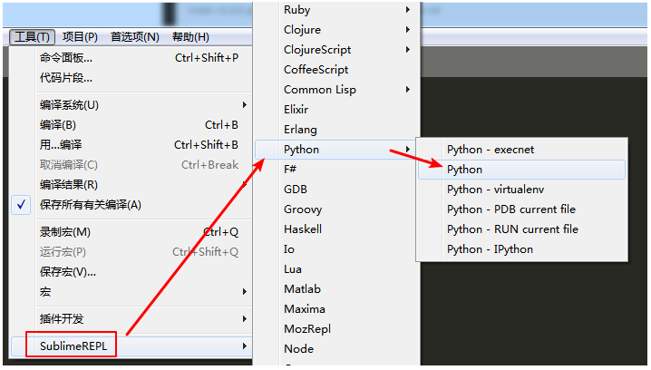 安装完成后,[工具]菜单中会出现[SublimeREPL]工具: