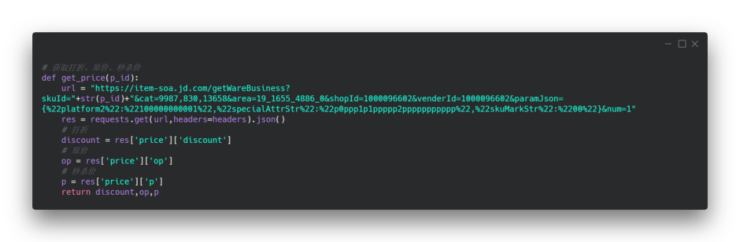 通过商品ID可以获取到商品打折、原价、秒杀价(这里有接口,接口是通过抓包获取的,感兴趣的可以去自己去尝试,不明白的可以直接使用)