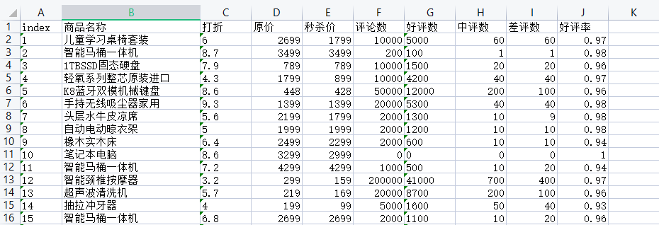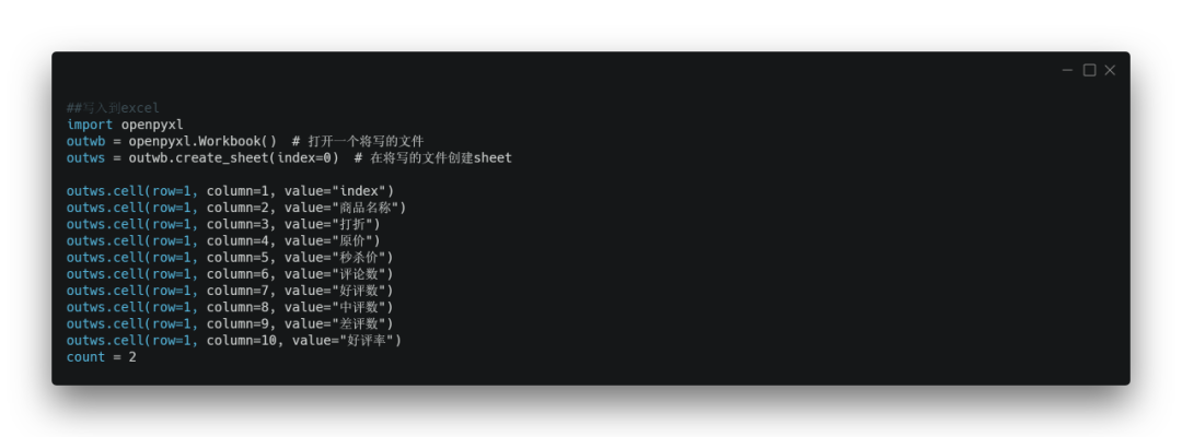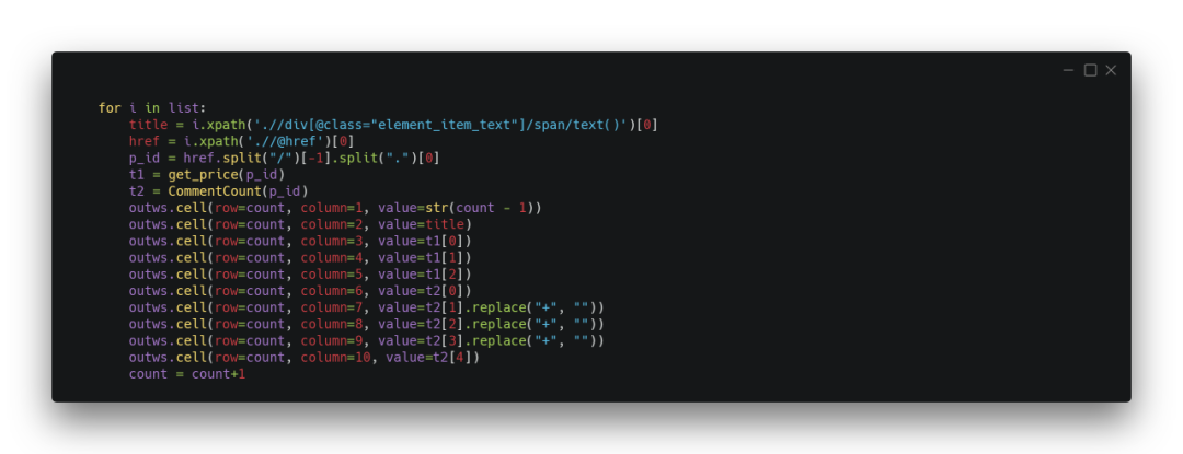 其中的get_price和CommentCount是步骤4和步骤5的函数。count是excel中行数,因此在循环中count+1,依次写入下一行。