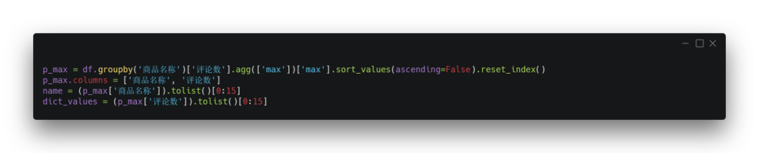 从数据中取出:商品名称和评论数这两列,这里根据评论数去作为销售依据,对商品的销量进行排序(高到低),并取出前15名进行可视化。