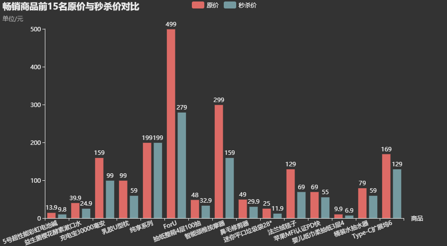 4.可视化-畅销商品前15名原价与秒杀价对比