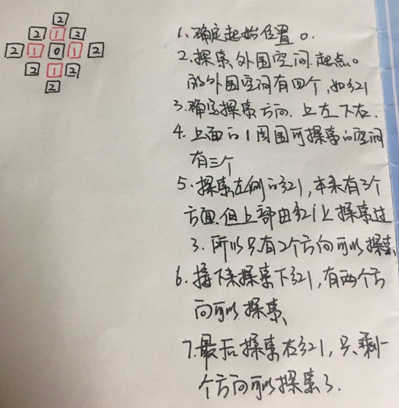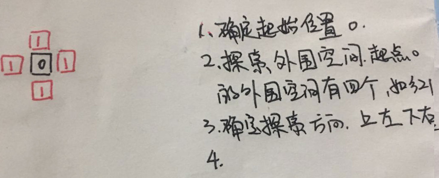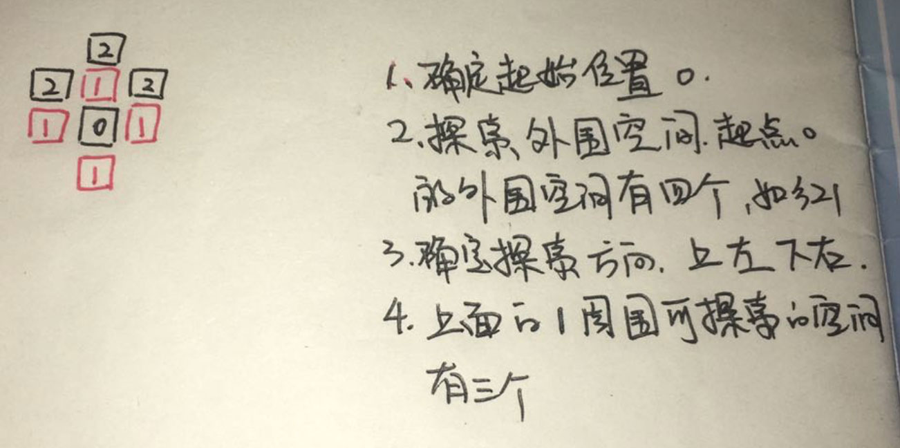 第一步, 我们先明确起点. 这个起点有上下左右四个方向可以探索. 我们按照顺时针顺序探索, 上 左 下 右