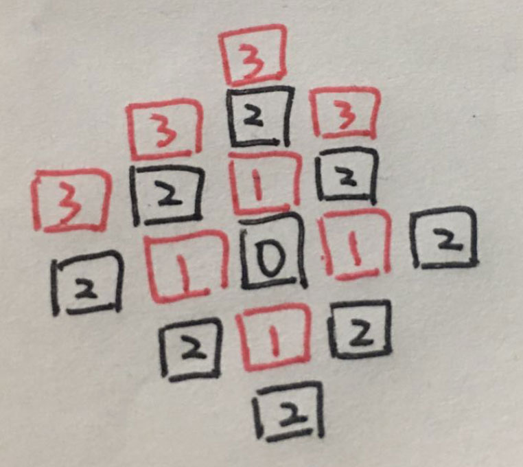 如上图红色标出的位置. 也就是起始位置可以向外探索的路径有4个. 上 左 下 右