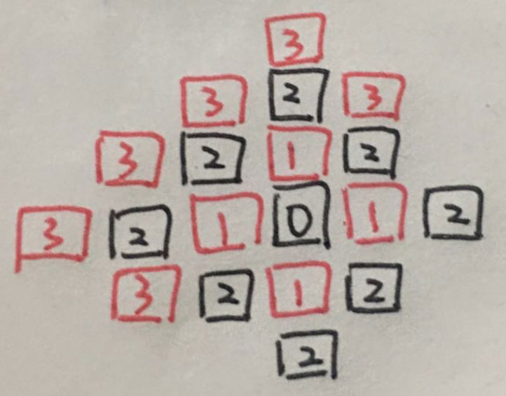 我们通过分析, 广度优先算法还有一个特点, 那就是循环遍历, 第一轮的红1都探索完了, 在进行黑2的探索, 不会说红1探索出来一个, 还没有全部完成,就继续向外探索.
