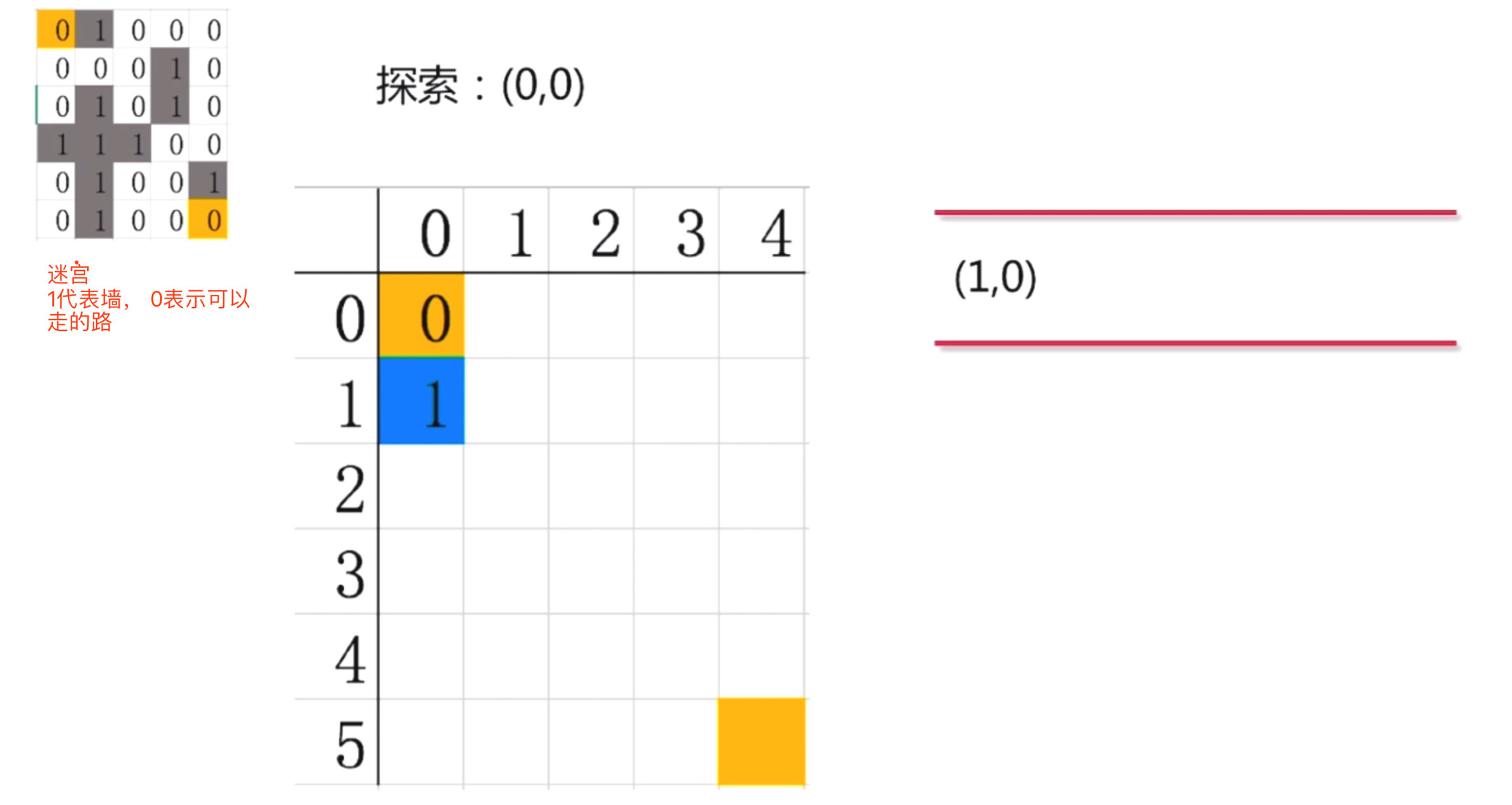 我们看到(0,0)只能向下走, 他的右边是一堵墙, 走不了. 上面,左面也不能走. 所以, 探索出来的路径只有一个(1,0), 吧(1,0)放入到队列中