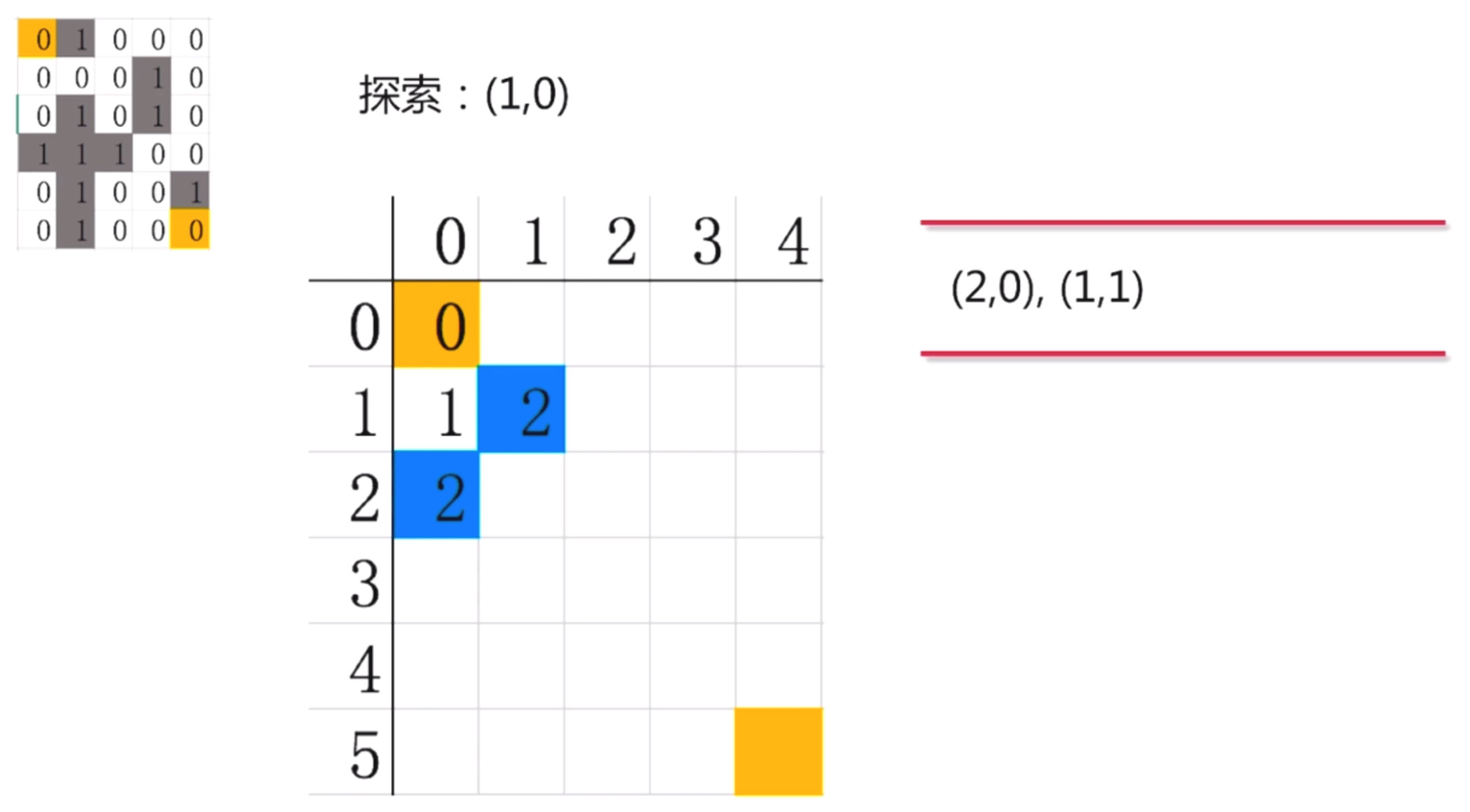 对照迷宫, (1,0)可以向下走, 可以向右走. 不能向上和向左. 因此, (1,0)探索出来两条路, (2,0) 和(1,1), 把这两个点放入到队列中