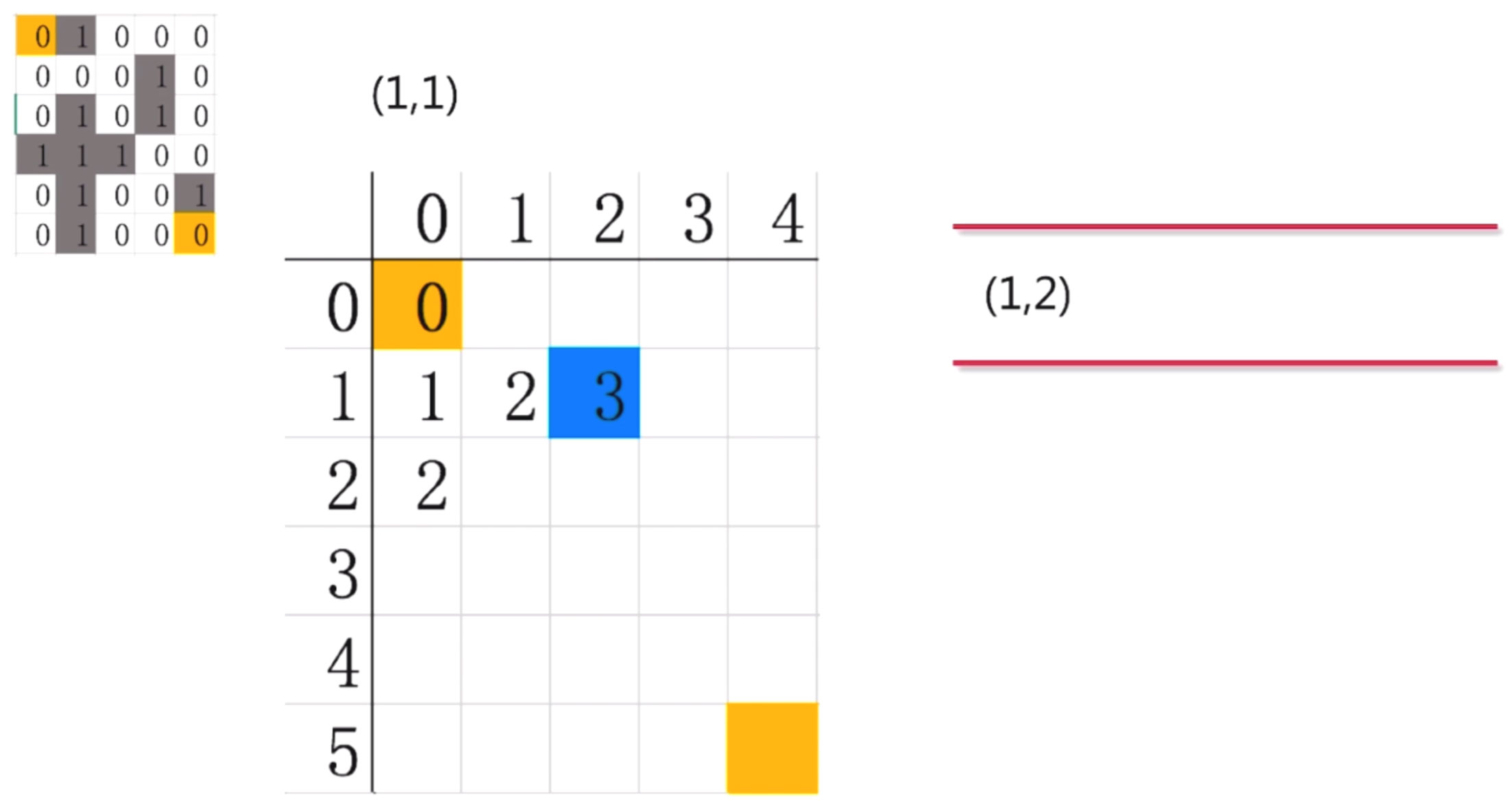 第五步: 继续探索(1,1), 对照迷宫, (1,1)只能向右探索到(1,2) , 因此我们把(1,2)放入队列中
