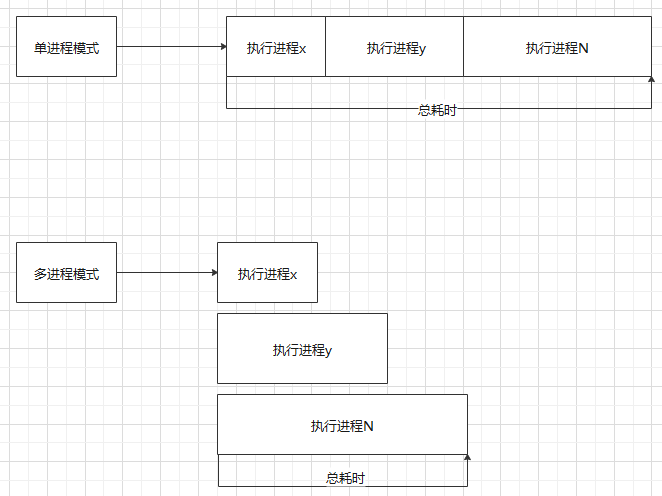 多个进程并排执行,总耗时就是最长耗时的那个进程的时间。