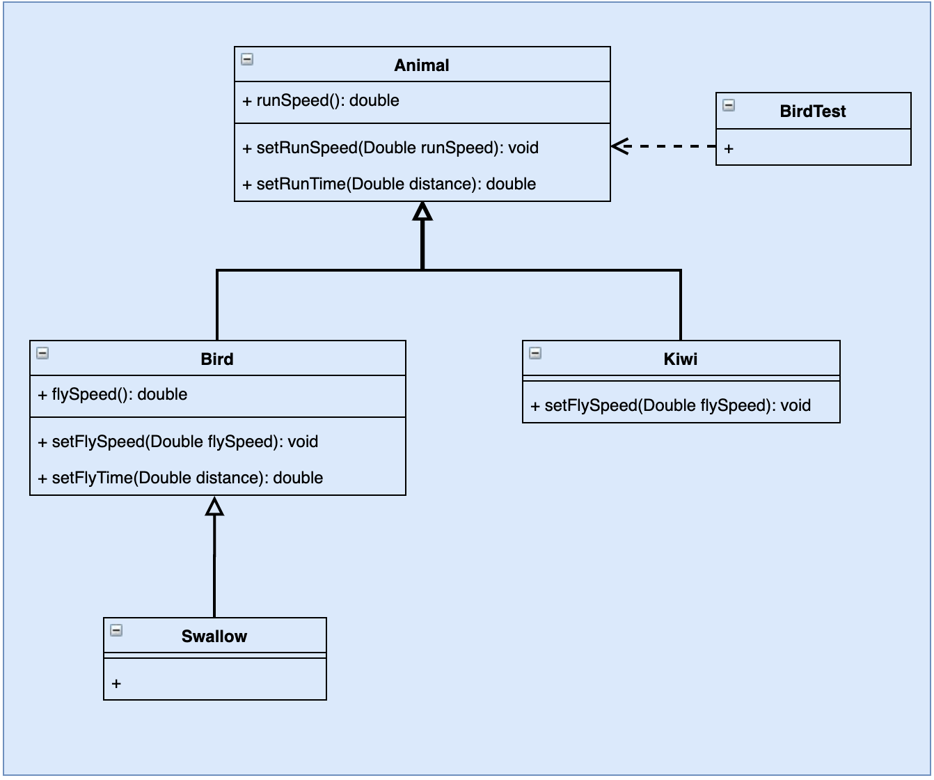 需求分析: 鸟通常都是会飞的, 比如燕子每小时120千米, 但是新西兰的几维鸟由于翅膀退化不会飞. 假如要设计一个实例,计算这两种鸟飞行 300 千米要花费的时间。显然,拿燕子来测试这段代码,结果正确,能计算出所需要的时间;但拿几维鸟来测试,结果会发生“除零异常”或是“无穷大”,明显不符合预期,其类图如图 1 所示。