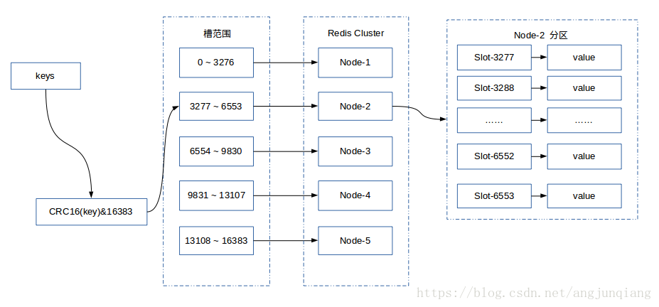 Redis Cluster是Redis的分布式解决方案,在Redis 3.0版本正式推出的,有效解决了Redis分布式方面的需求。当遇到单机内存、并发、流量等瓶颈时,可以采用Cluster架构达到负载均衡的目的。分布式集群首要解决把整个数据集按照分区规则映射到多个节点的问题,即把数据集划分到多个节点上,每个节点负责整个数据的一个子集。Redis Cluster采用哈希分区规则中的虚拟槽分区。虚拟槽分区巧妙地使用了哈希空间,使用分散度良好的哈希函数把所有的数据映射到一个固定范围内的整数集合,整数定义为槽(slot)。Redis Cluster槽的范围是0 ~ 16383。槽是集群内数据管理和迁移的基本单位。采用大范围的槽的主要目的是为了方便数据的拆分和集群的扩展,每个节点负责一定数量的槽。Redis Cluster采用虚拟槽分区,所有的键根据哈希函数映射到0 ~ 16383,计算公式:slot = CRC16(key)&16383。每一个实节点负责维护一部分槽以及槽所映射的键值数据。下图展现一个五个节点构成的集群,每个节点平均大约负责3276个槽,以及通过计算公式映射到对应节点的对应槽的过程。