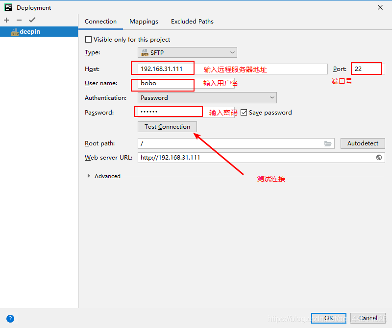 选择Connection tab页,输入远程服务器地址、用户名和密码,点击Test Connection(测试连接)