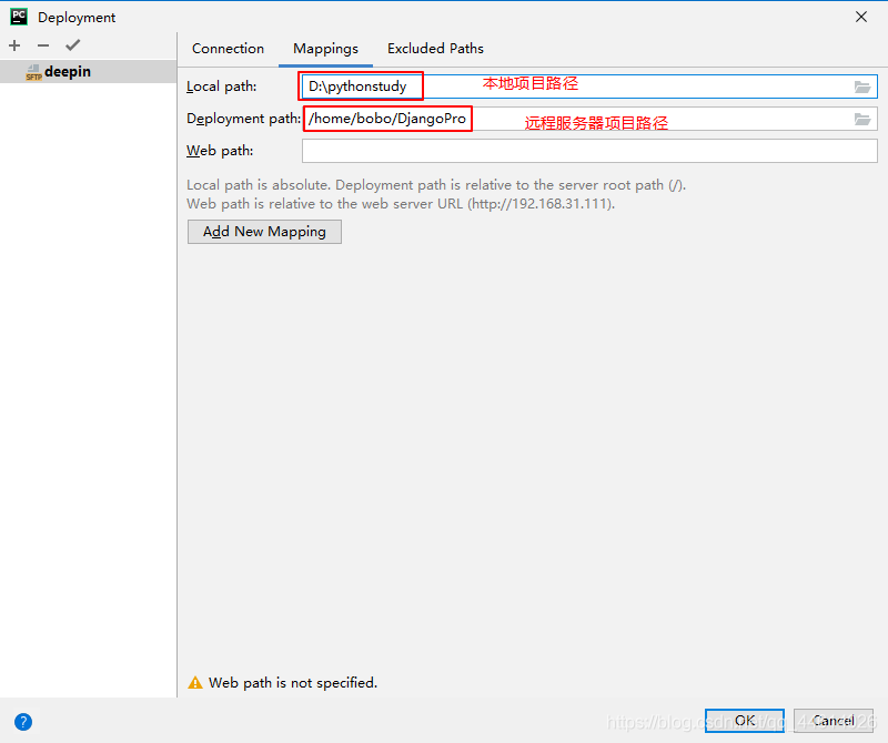 选择Mappings tab页,配置本地项目所在路径和远程服务器项目所在路径。这样只要某一方进行了修改,都可以手动进行代码同步
