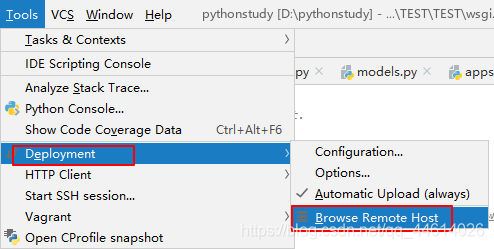 点击 Tools(工具),点击 部署Deployment(部署),点击Browse Remote Host(浏览远程主机)