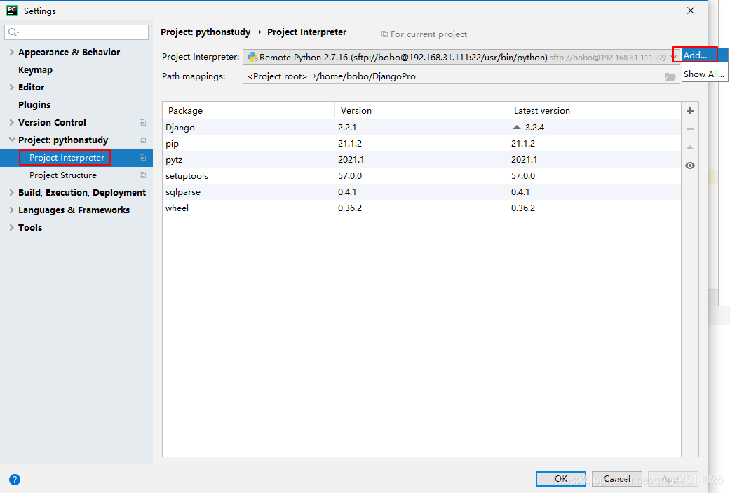 1、点击左上角 Files → Settings ,点击Project Interpreter,点击Add