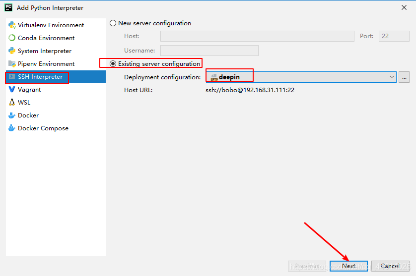 2、选择SSH Interpreter,选择Existing server configuration,选择远程服务器
