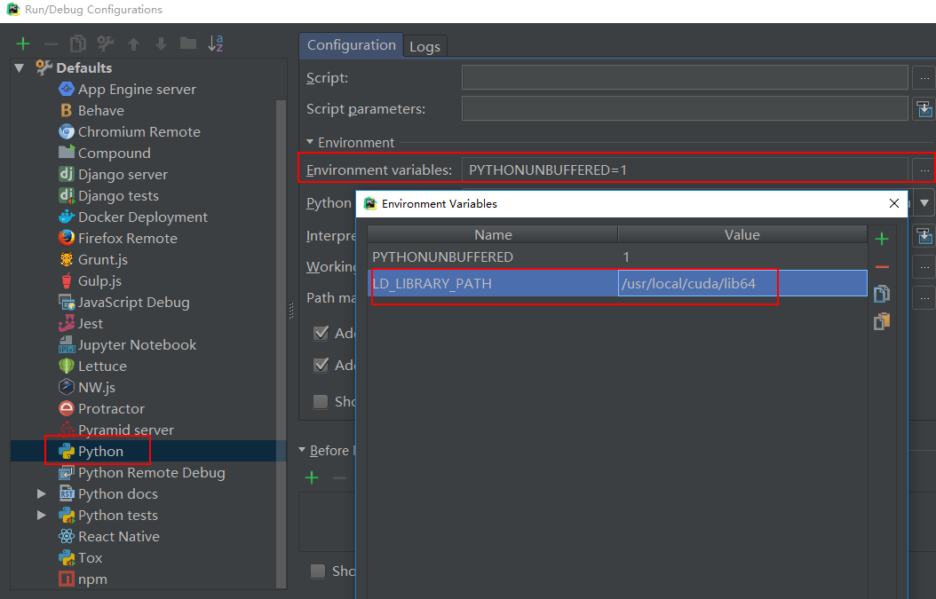 解决:在edit configurations中配置python运行环境变量,添加LD_LIBRARY_PATH,设置路径/usr/local/cuda/lib64