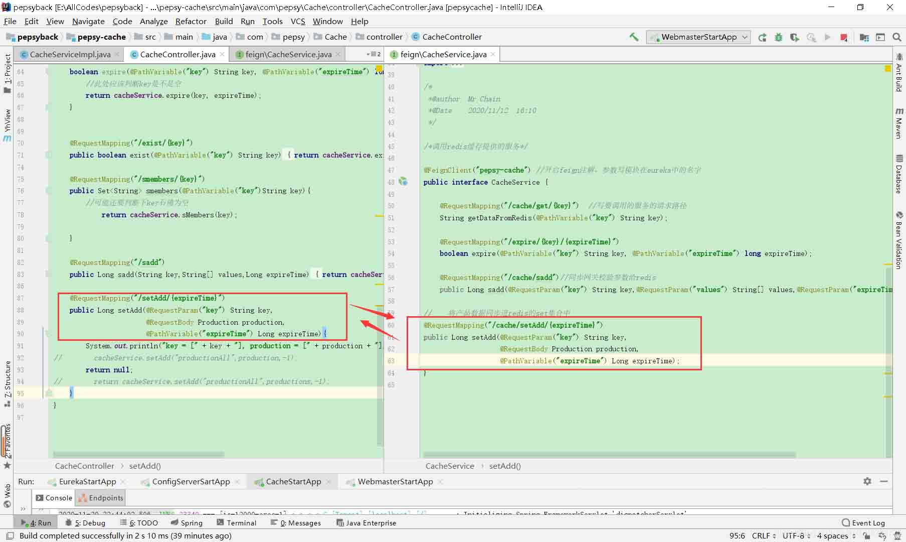 写了一个简单案例,同时传输一个对象和一个字符串作为请求参数,主要关注参数的声明,其余比如eureka和feign的依赖和配置和后续使用相关的知识请另行查阅。仅供参考: