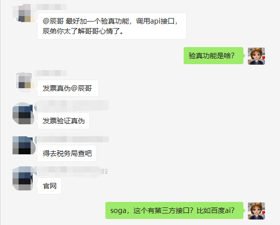 在辰哥的交流群里,和小伙伴聊到这个内容时,小伙伴建议可以加一个功能:发票验证真伪。