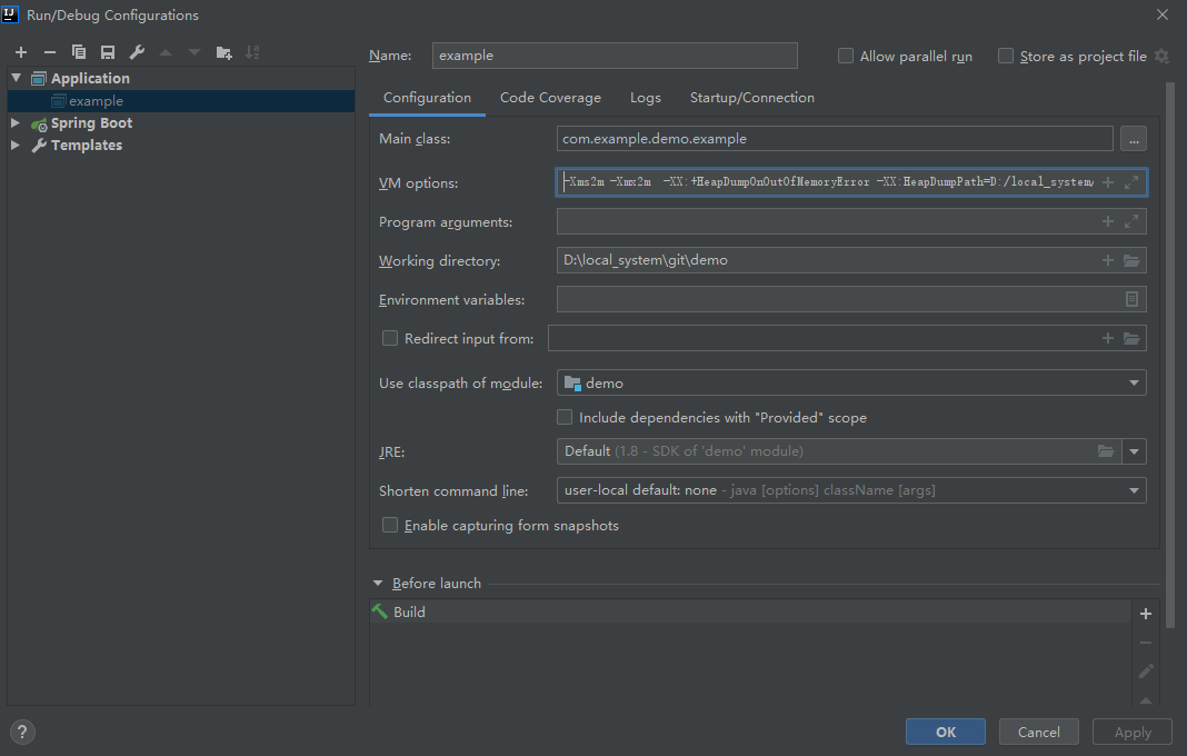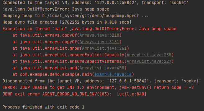 给这个测试类设置虚拟机参数,设置如:-Xms2m -Xmx2m -XX:+HeapDumpOnOutOfMemoryError -XX:HeapDumpPath=D:/local_system/git/demo/heapdump.hprof