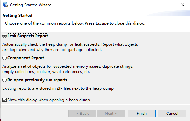 在弹出框处,选择Leak Suspects Report,这是指内存泄漏报告——
