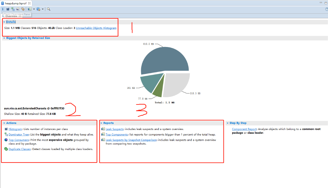 1.Details显示的是dump文件的情况,表示堆大小为1.1MB,有516个class,40.2k个Object,3个类加载器等;