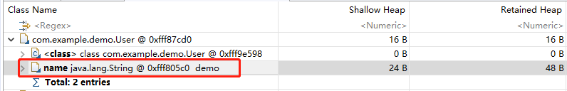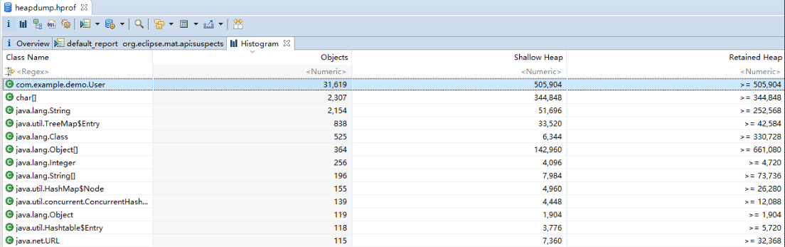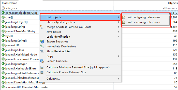 根据这个Histogram视图,我们可以发现,com.example.demo.User数量和占用内存大小都比较高,同时说明了该User对象一直没有被GC回收掉,这时,可以右击,弹出框有以下一些菜单选项——