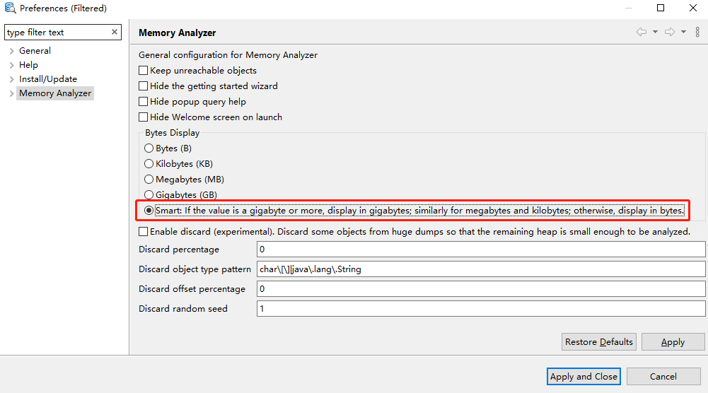 以Class Name为维度,分别展示各个类的对象数量,Shallow Size,Retained size。这里有一个疑惑是,Shallow Size和Retained size没有显示是以什么为单位的,它默认是以byte为单位的,若要显示地让单位展示出来,可以这样设置,点击Window->Preferences