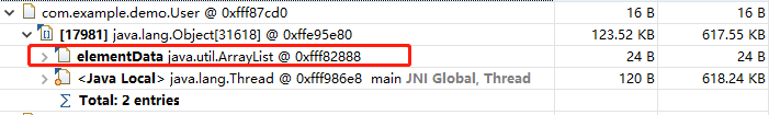 在案例代码当中,是以list.add(User)来不断存储User对象的,如截图所示,通过MAT可确定,存在一个ArrayList集合一直引用该User对象。