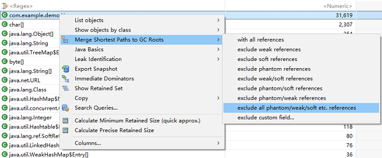 Merge Shortest Paths to GC Roots->exclude all phantom/weak/soft etc. references