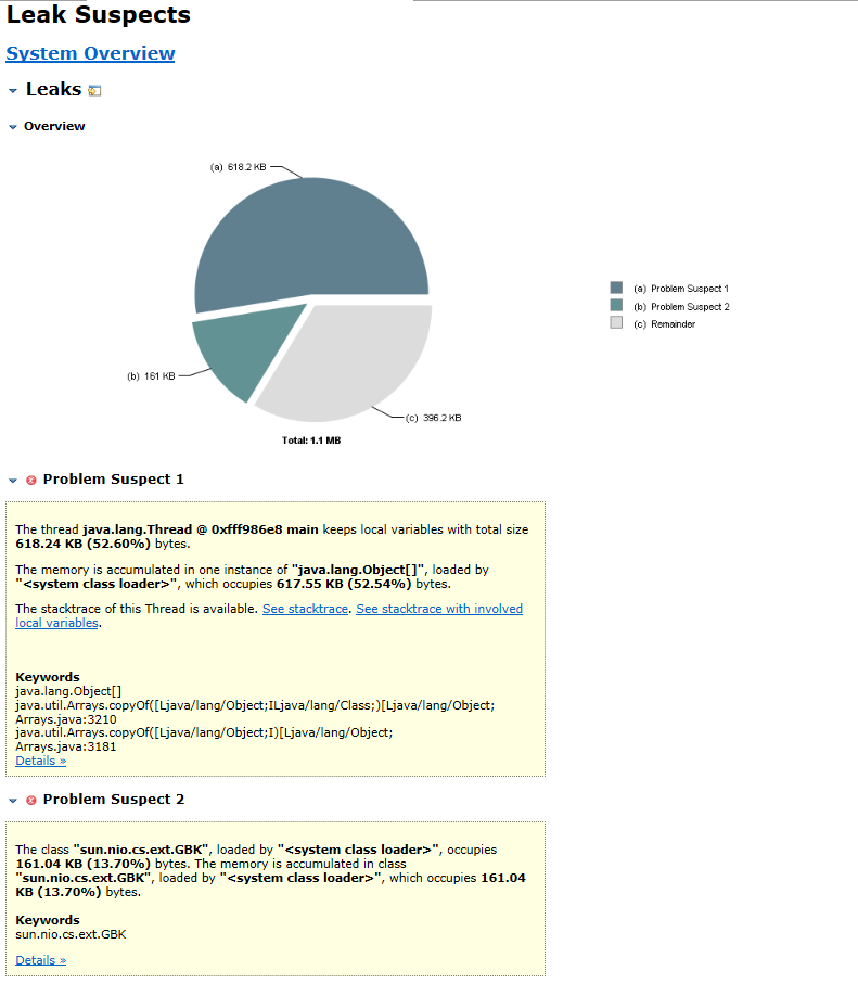 Leak Suspects报表很直观地展现了一个饼图,图中颜色深的部分表示可能存在内存泄漏的嫌疑。每一个模块都有对应的详情信息。