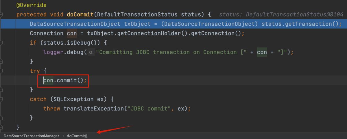 AbstractPlatformTransactionManager#commit抽象事务管理器,进行提交事务DataSourceTransactionManager#doCommit数据源数据管理器,提交事务