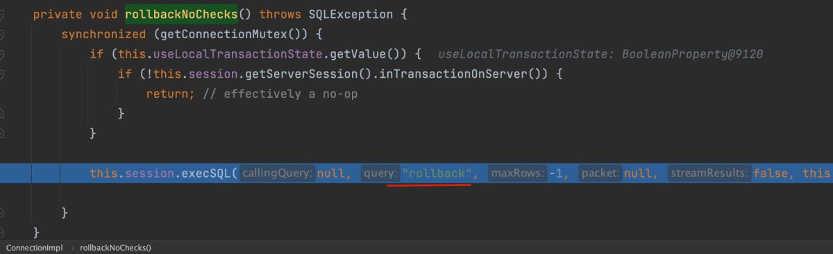 最终执行到 mysql-connector-java-8.0.25.jar 的 ConnectionImpl#rollback() 到 ConnectionImpl#rollbackNoChecks