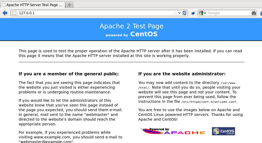 然后打开浏览器,输入我们的 127.0.0.1 来访问,此时看到的界面是Apache的测试界面: