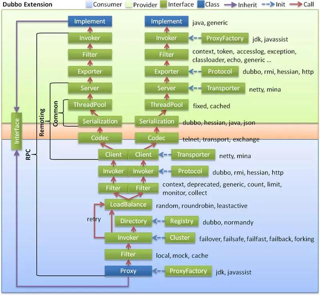- 远程调用层(Protocol):封装RPC调用,以Invocation和Result为中心,扩展接口为Protocol、Invoker和Exporter。
