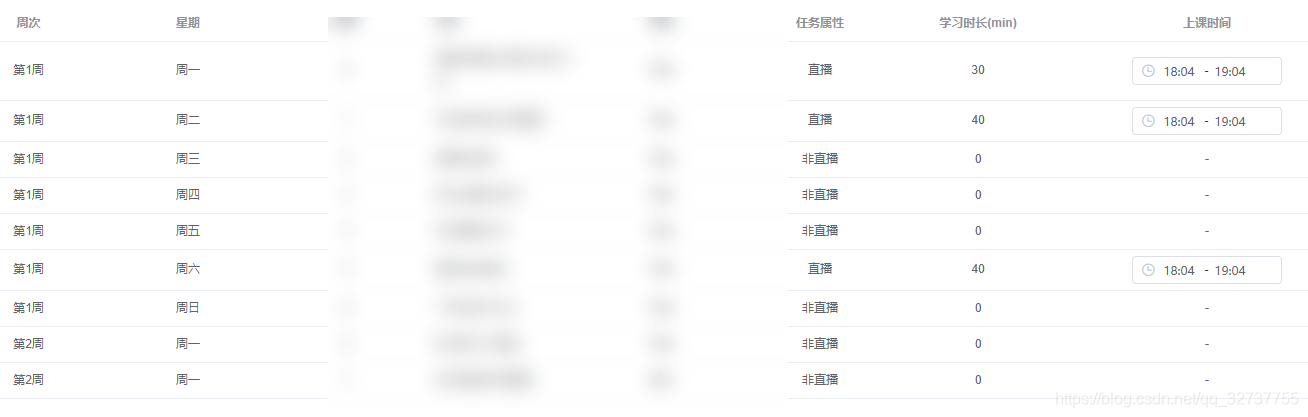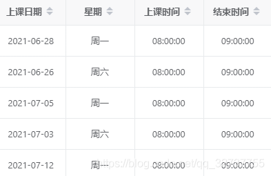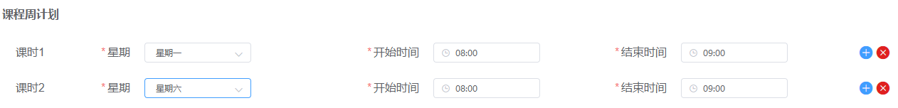 固定每周的固定时间上课(例:共上20节,每周六、周日早上8点-10点上课。假如今天周六凌晨1点,那么排课也需要从今天开始)总共上几个周,每周上课时间比较个性化(例:共上三周,第一周周一周二早上8点-10点上课;第二周周三周四下午8点-10点上课;第三周周日中午11点-12点上课。)