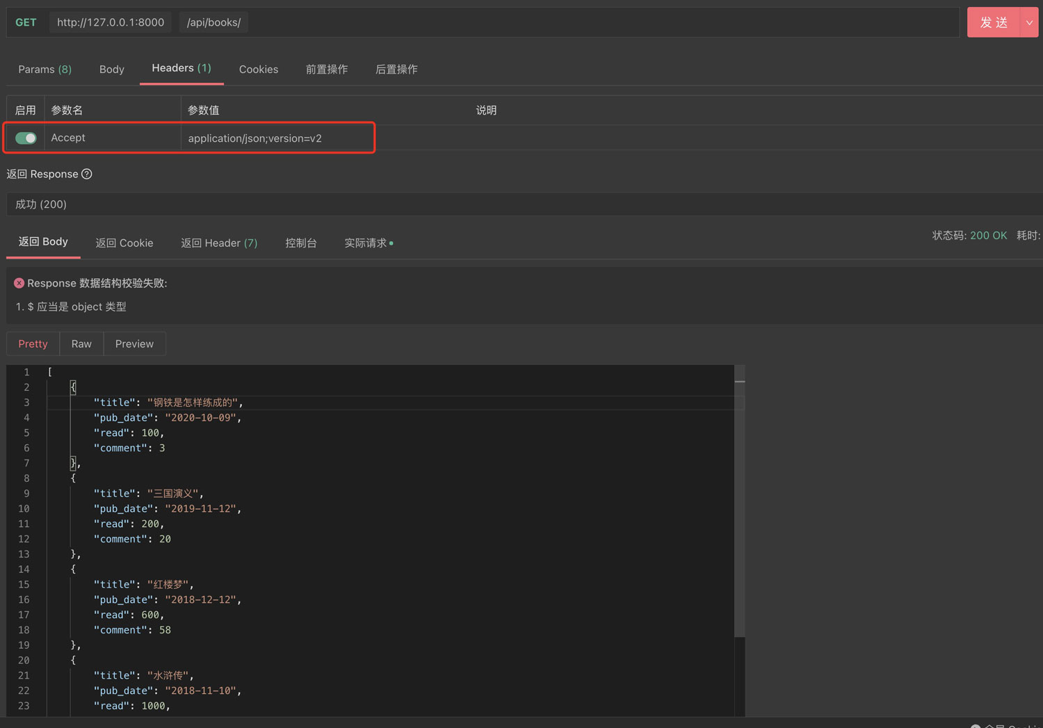 我们在请求头中添加字段Accept:application/json;version=v2,就会返回BookSerializerV2的序列化字段,也就是没有image字段