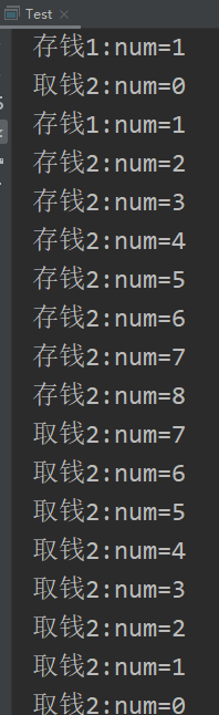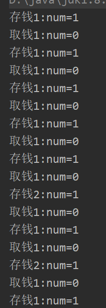 上述线程通信看起来似乎没有什么问题,但若此时将存钱和取钱的人数各增加1,再看运行结果