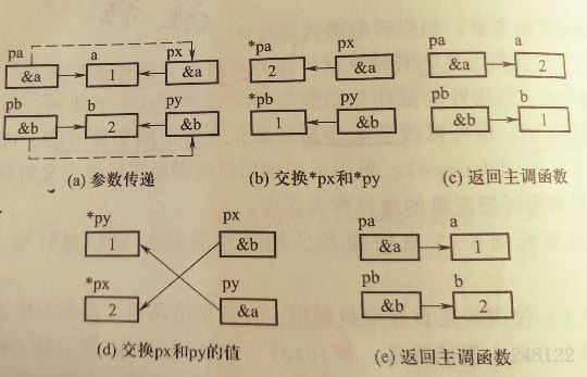 第二个swap2函数由图可知,pa和px都是a的地址,pb和py都是b的地址。此函数改变*px,*py的值。因为*px和a在同一储存单元,*py和b在同一储存单元。以改变实参指针变量所指向的变量的值。所以如图*pa和*pb的值也改变了,最后输出结果也就改变了。